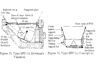 Type BFF 1b, designed in Senegal, has a funnel – like reflector. Telkes also suggested a modification such as a box with an aperture set at 450. Bowman, Blatt (1978) tried to maximize the dimensions of the Telkes cooker. The outer 'A' type of stand was eliminated, but the inner cradle was retained. Alzek reflectors were used instead of glass mirrors. A new type of insulation material foam glass was used to make the box. A temperature of 2250C was reported (Figure 50). The author tried this variation, that is concept XI, here at Udupi, but as foam glass was not available, a box of GI sheets was used and insulated with mineral wool. Regular glass mirrors a transparent PVC sheet was used on top. To effect the tilting, a steel frame support was incorporated. The assembly worked well but compared to the single or double mirrored Gosh type design the cooking time was not reduced to one-fourth as expected. (Type BFF le, Figure 51).